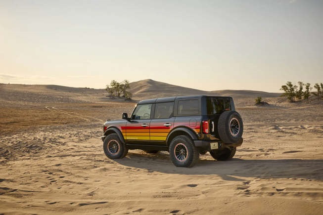 El paquete Free Wheeling agrega colores inspirados en el atardecer similares a los que Ford ofreció en una variedad de camionetas, furgonetas y los primeros Broncos durante las décadas de 1970 y 1980. El mismo paquete de apariencia también se ofreció en el Bronco Sport más pequeño el año pasado